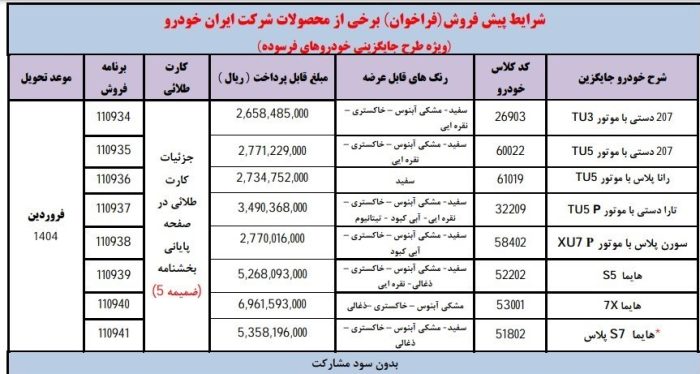 طرح پیش فروش (فراخوان) محصولات قابل عرضه شرکت ایران خودرو ویژه متقاضیان طرح جایگزینی خودروهای فرسوده غیر تاکسی ۱۴۰۳ مطابق جدول فوق از روز شنبه مورخ ۱۴۰۳/۱۰/۰۱ شروع و تا پایان روز دوشنبه مورخ ۱۴۰۳/۱۰/۱۰ ادامه خواهد داشت.